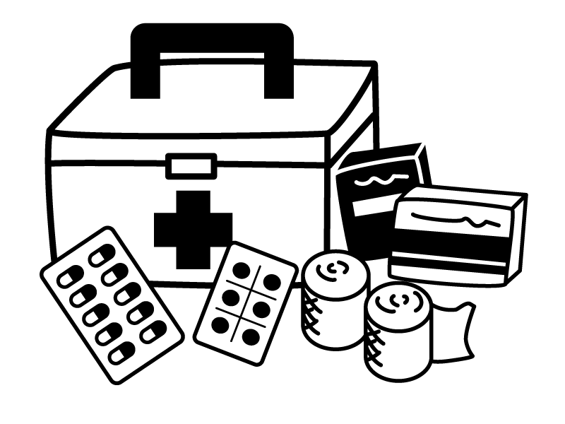 救急箱と薬などの白黒イラストかわいい無料の白黒イラスト モノぽっと。