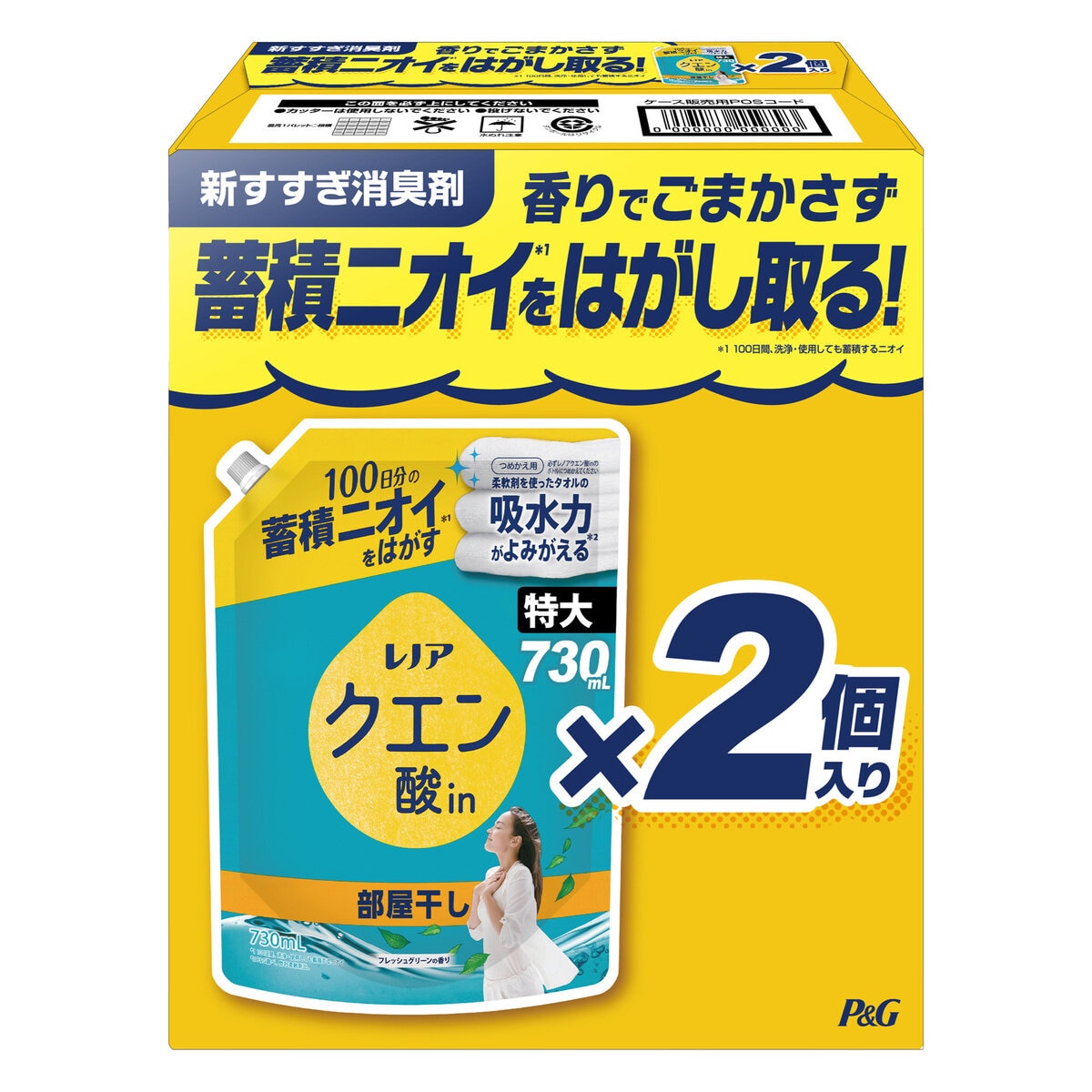 レノア クエン酸IN 超消臭 すすぎ消臭剤 柔軟剤 部屋干し フレッシュグリーン 詰替え 720ml x 2パック。