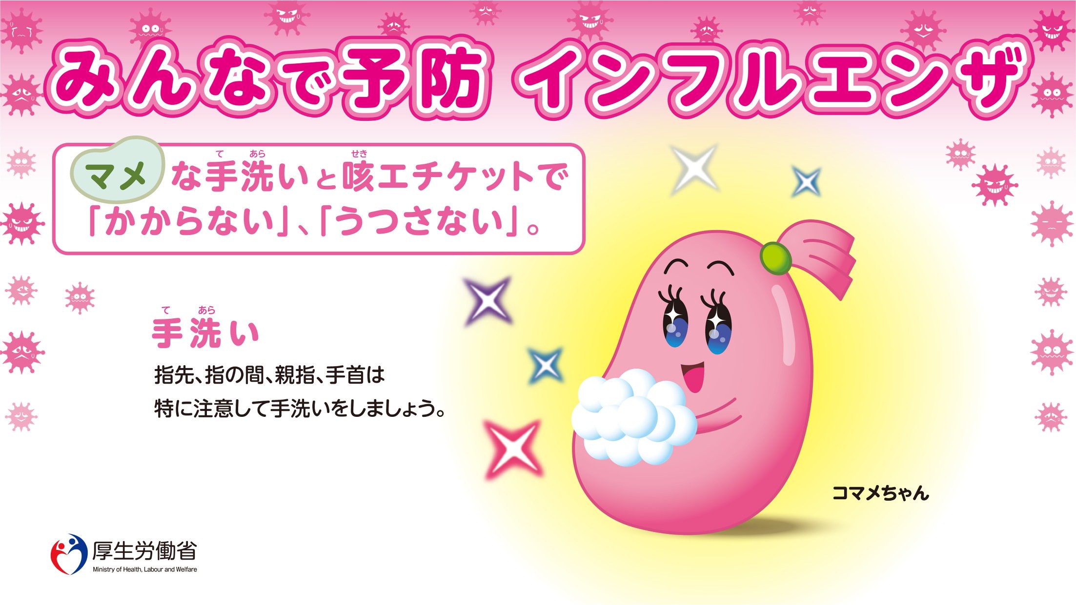 厚生労働省 on X: "インフルエンザ のマメ便り流水と石けんによる手洗いは、手や指についたインフルエンザウイルスを取り除くために有効なの。感染症対策の基本です!アルコール製剤で手や指を清潔に保つことも、インフルエンザウイルスには効果があります。