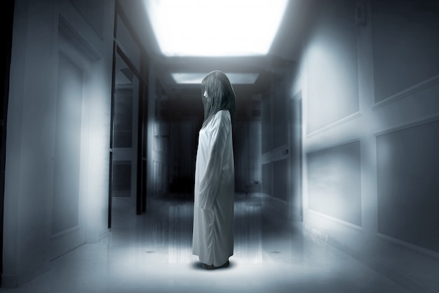 血と怒った顔を持つ恐ろしい幽霊女は、放棄された建物に出没しましたPremium写真。