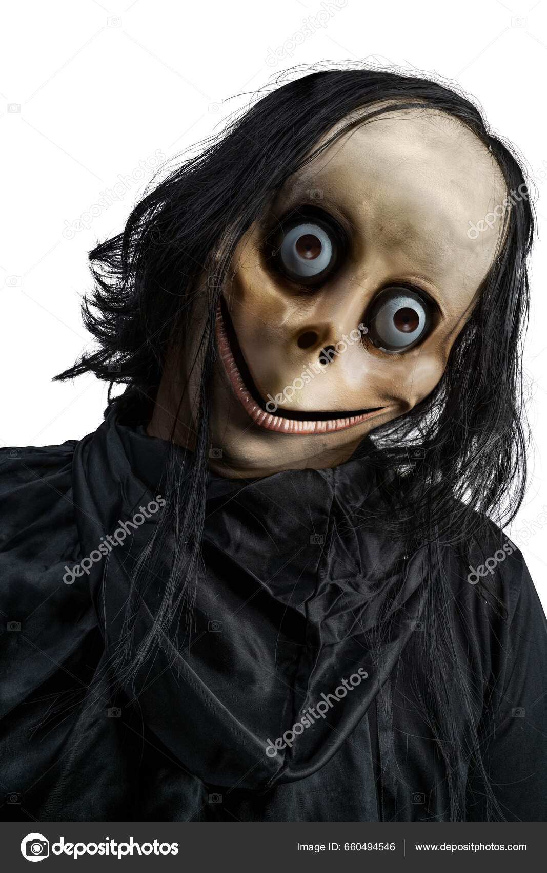 白い背景の上に隔離された恐ろしいモモ ハロウィンの装飾のための怖い顔 — ストック写真 © leolintang660494338。