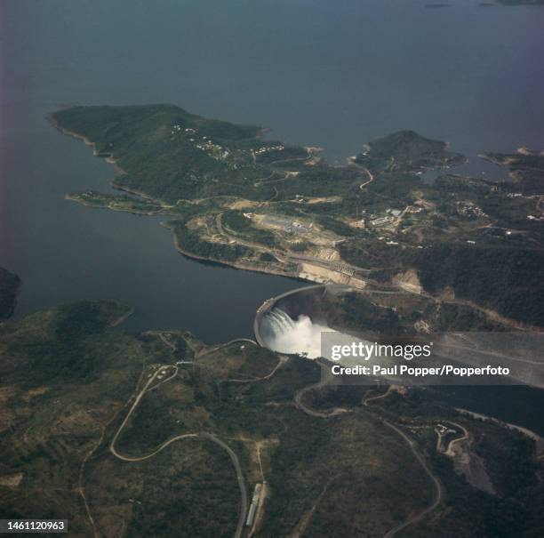 空から見たカリバダム。ザンビアとジンバブエの間のザンベジ川流域のカリバ峡谷にあるコンクリート製のアーチダム写真素材1376116481Shutterstock。