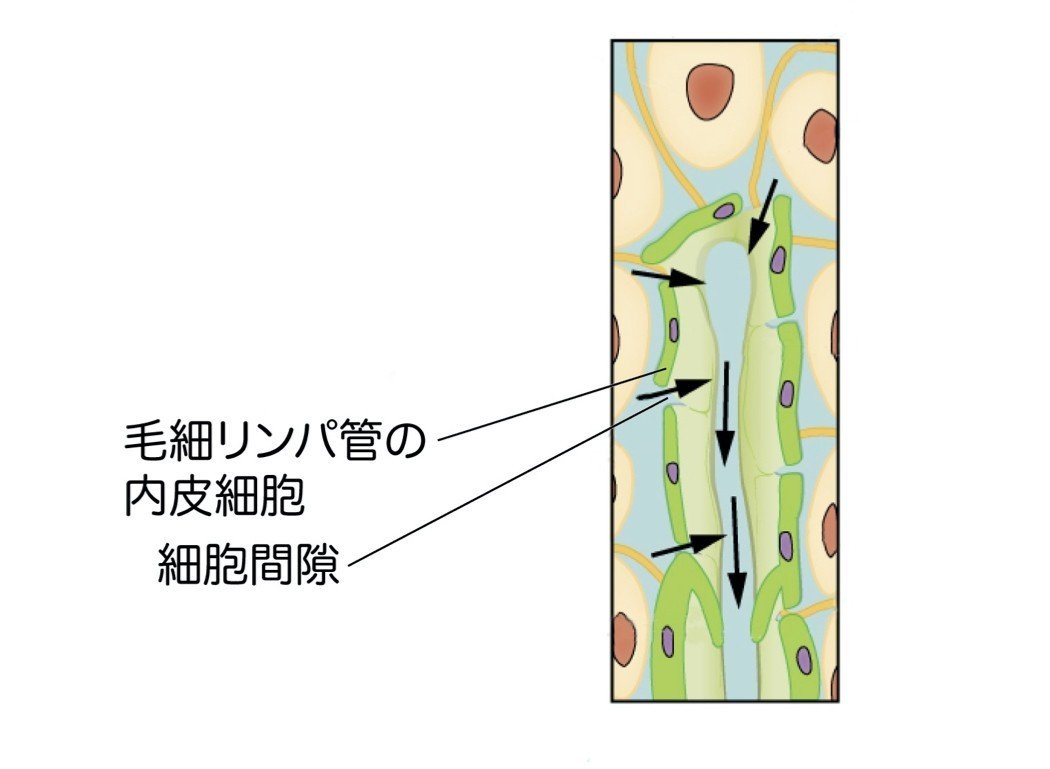 リンパ管の構造と機能 ○毛細リンパ管の構造と特徴 ・起始部は閉鎖されており、単層扁平上皮 内皮 と基底膜からなる非常に薄い構造。 ・毛細血管よりも 内皮細胞間の接合が緩く、細胞間隙が大きいため、分子量の大きなタンパク質や脂質、細胞成分なども容易に通過できる。