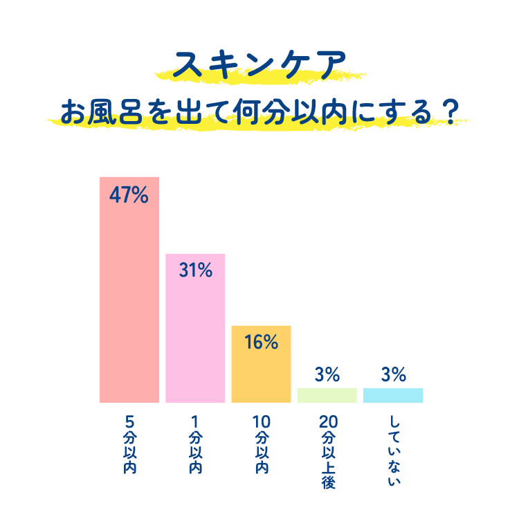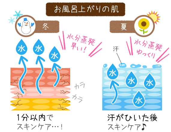 お風呂あがりは、5分以内に即保湿しようスキンケア大学。