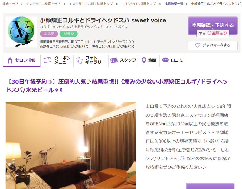 痛くない小顔矯正コルギ骨気とドライヘッドスパsweet voice♪ホットペッパービューティー福岡・春日市小顔矯正痛くないソフトコルギエステサロンハーブピーリングの最高峰グリーンピールドライヘッドスパ『sweetvoice♪』。
