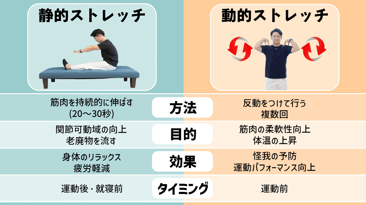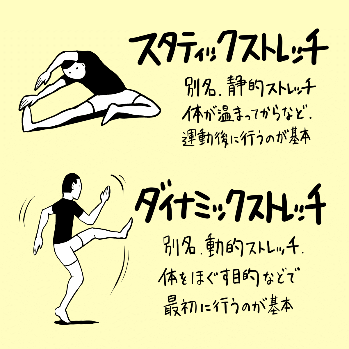 動的ストレッチと静的ストレッチのやり方と効果の違い:超簡単まとめ。