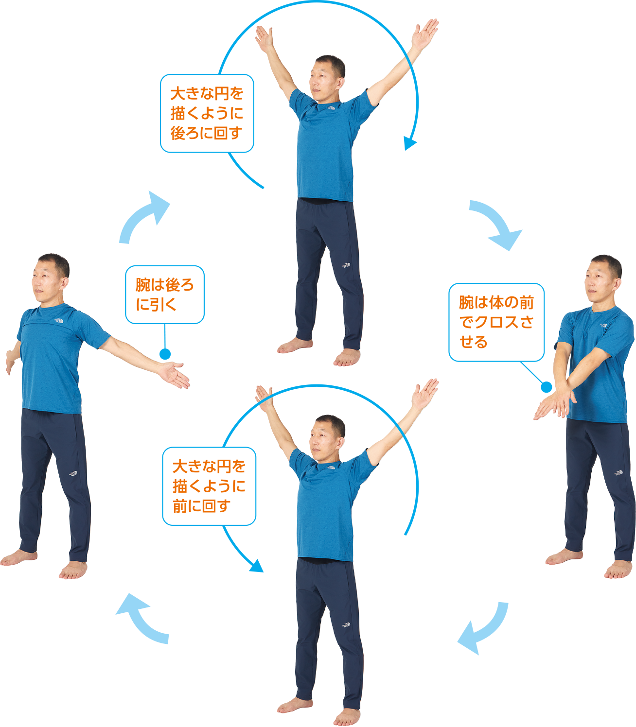 肩凝り改善肩のけが予防 アームサークルダイナミックストレッチ。