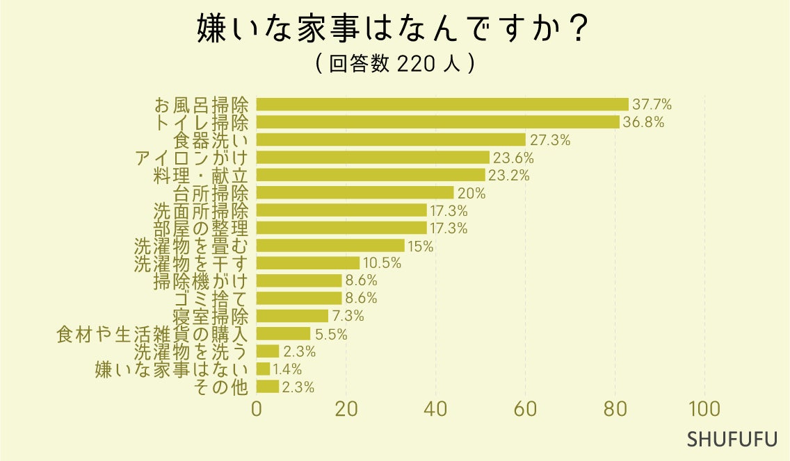 主婦220人に聞きました!”嫌いな家事”ランキング2位は「トイレ掃除」1位は?嫌いな家事の負担を軽減するための対策は?株式会社しんげんのプレスリリース。
