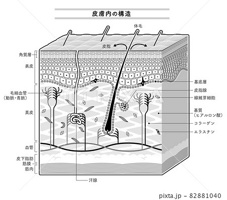 皮膚内部の構造を示すイラスト。日本語表記。モノクロカラー。のイラスト素材82881040- PIXTA。