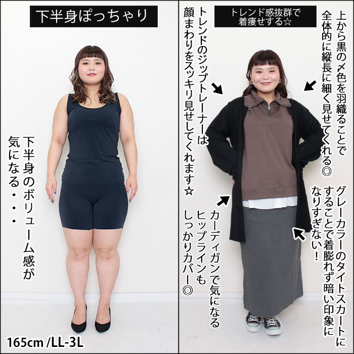 低身長&下半身ぽっちゃりさん必見! ドッシリ見えない着痩せコーデ☆ LL-5L。