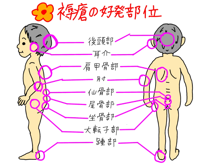 褥瘡は、どこにできやすい?褥瘡好発部位仙骨部、踵部、尾骨部など。