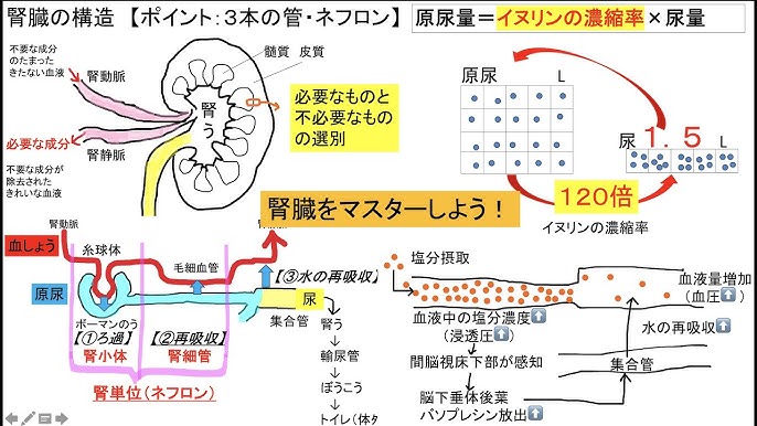 生物基礎23 腎臓のはたらきを説明せよ!腎小体 ろ過 腎細管 再吸収 =機能単位ネフロン - YouTube。