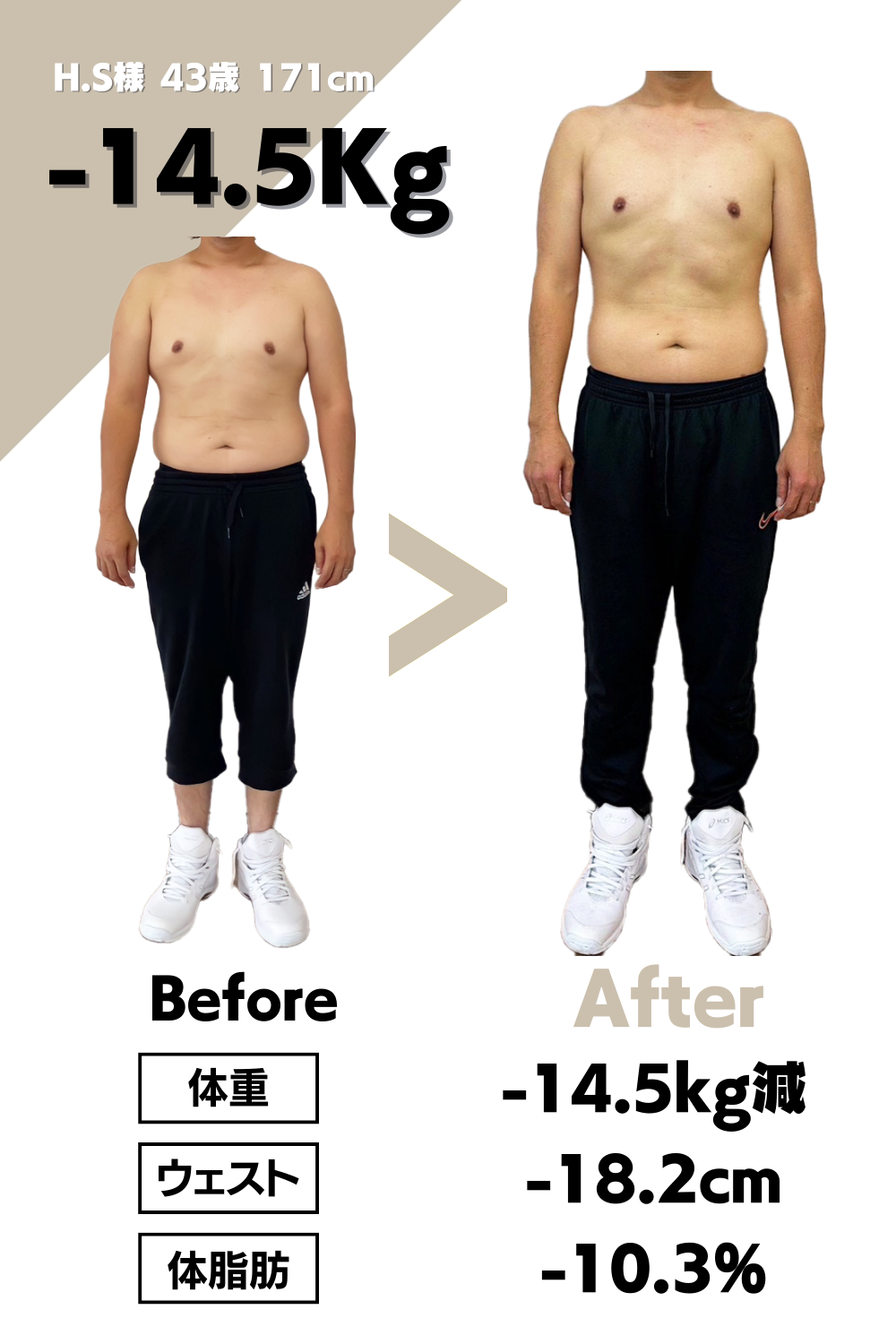 体脂肪−12%減!30代男性の方のダイエットビフォーアフター大阪府八尾市のパーソナルジムでトレーニングならROSSO。