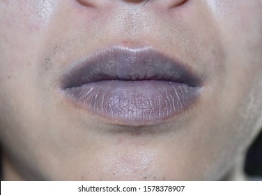 先天的な心臓疾患を持つ東南アジアの若い女性のチアノーゼの唇または中心性チアノーゼ。写真素材2048074505Shutterstock。