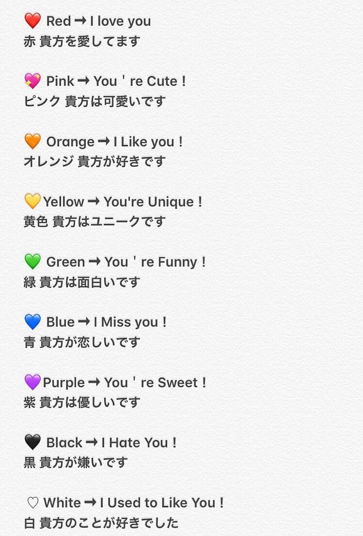 L O V E. on X: "💞ハートの色の意味💞 赤→愛してるよ ピンク→可愛いね 緑→面白いね オレンジ→好きだよ 白→好きだったよ黄色→ユニークだね 黒→嫌いだよ 青→寂しいよ 紫→優しいね 茶色→親友だよ 水色→私はあなたの知らなかった人RThttps:t.co ejELvLVLRQ"X。