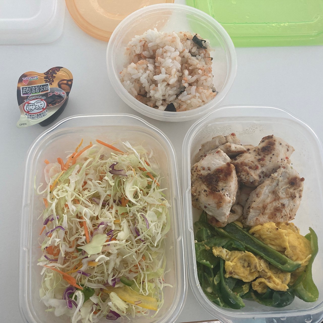 ダイエットお昼のお弁当例 玄米ご飯、サラダ、鶏肉、ピーマン、こんにゃくゼリー 福岡のパーソナルジム・ピラティスブログ「ダイエットは明日から」。
