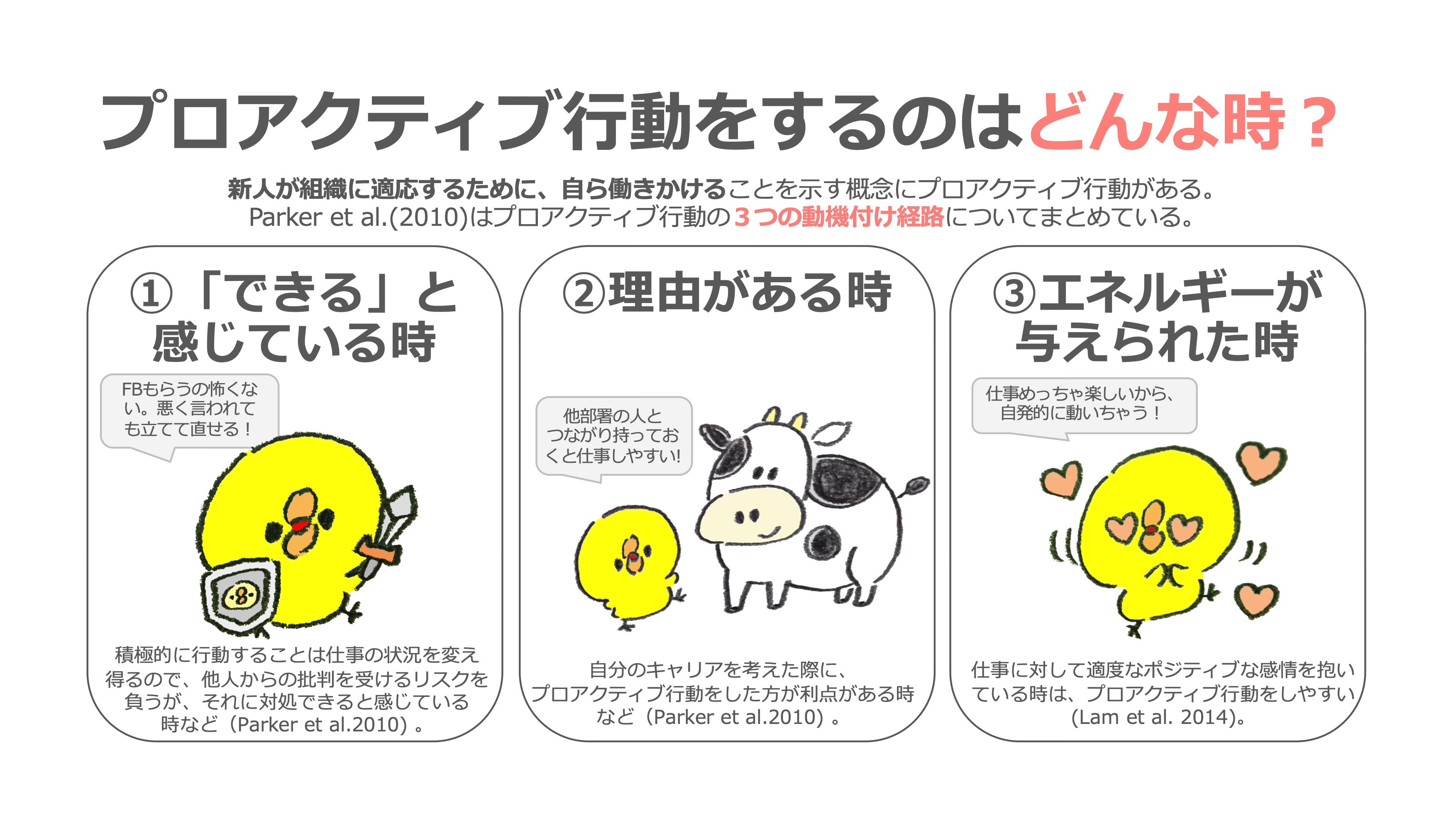 池田めぐみ『チームレジリエンス』発売中🎉 on X: "新人が組織に適応するために、自ら働きかけることを示す概念である、プロアクティブ 行動。では、どんな時に新人はプロアクティブ行動をするのでしょうか?Parker et al. 2010 やLam et al. 2014 をもとに、「 プロ。