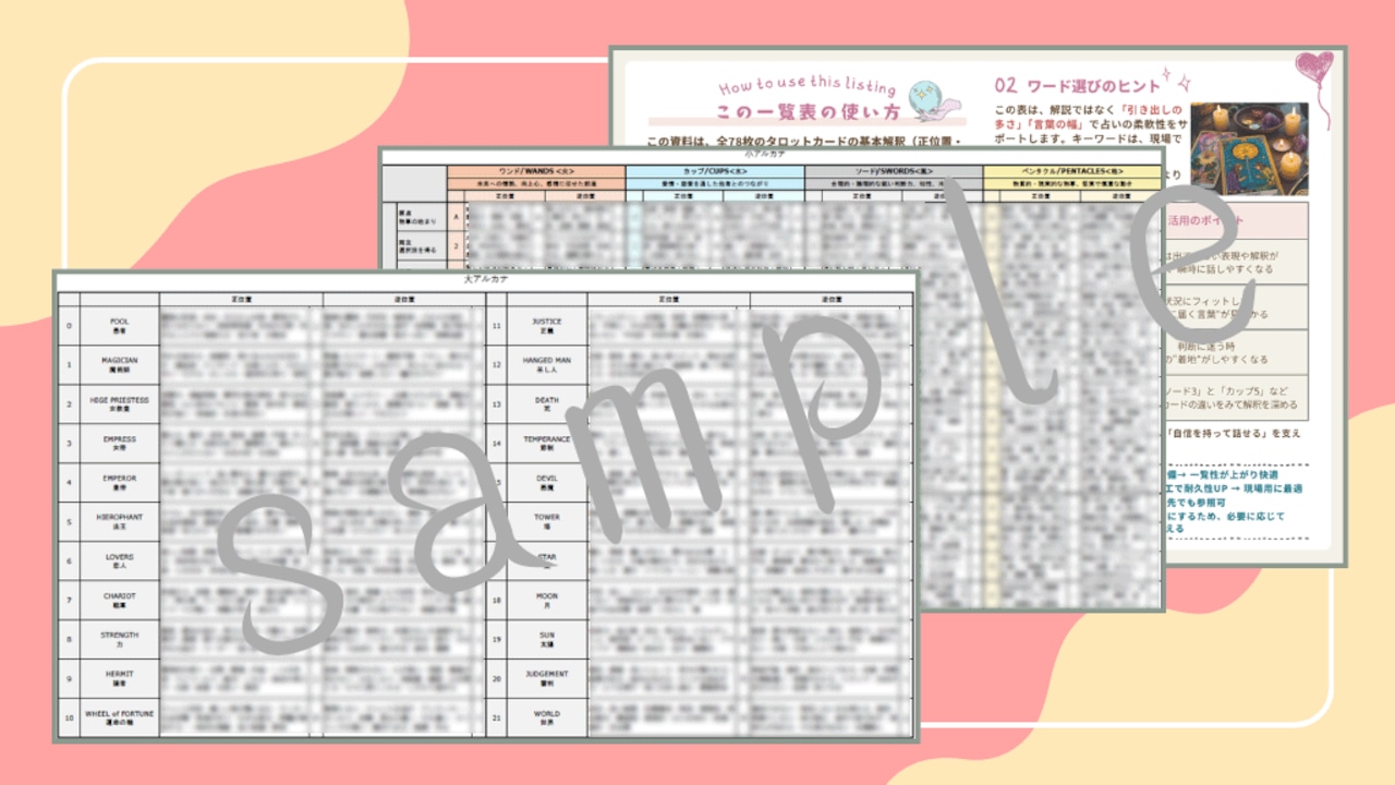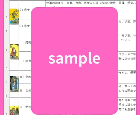 タロット大アルカナ詳細解釈一覧表PDF提供します 基本キーワード 出来事の解釈例+人間関係 恋愛上の意味ココナラ。