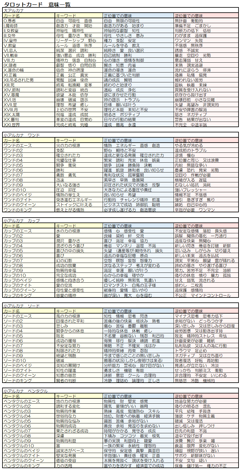 忙しい人向け早見表有 タロットカード 意味 一覧表 全78枚タロットの真実。