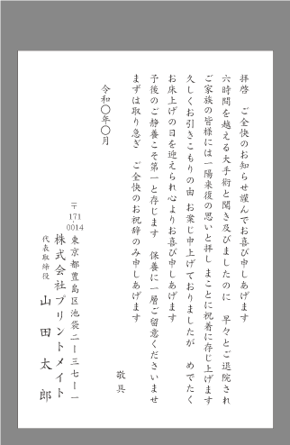 お祝い状・祝賀状 全快・退院 ビジネス文例1枚~即日印刷プリントメイト。