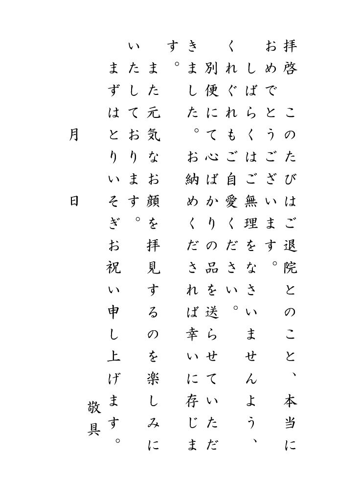 退院のお祝い状 退院祝い の書き方・例文・文例 書式・様式・フォーマット 雛形 ひな形葉書・はがき・ハガキテンプレート01 縦書きワードWord-文書 テンプレートの無料ダウンロード。