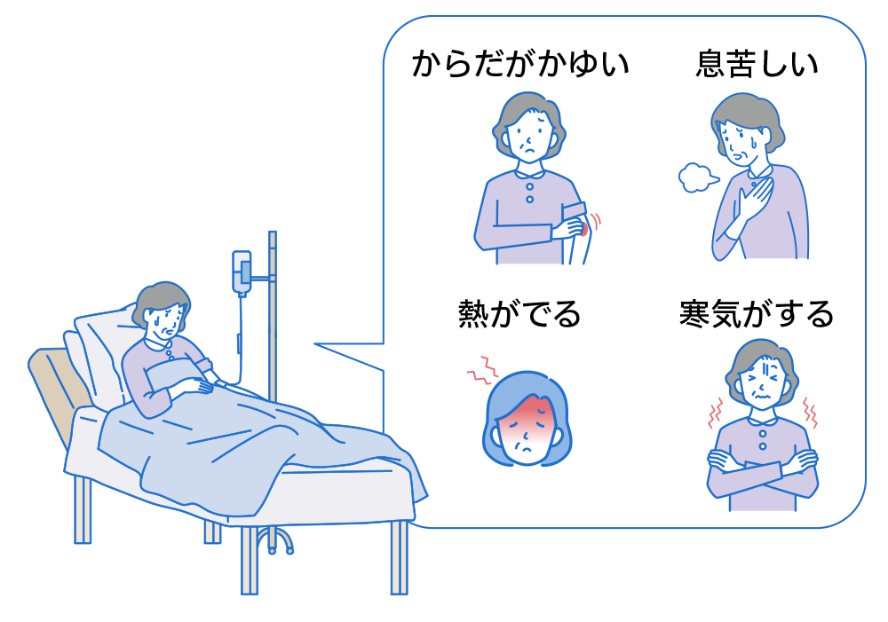テセントリクの副作用として、点滴中または点滴後にからだがかゆい、息苦しい、熱がでる、さむけがするなどの症状がでることはありますか?テセントリクQ&A一覧患者さん向け医薬品・医療機器情報患者さん・一般の皆さま中外製薬株式会社。
