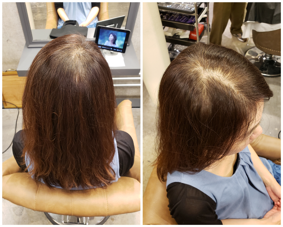 細毛猫っ毛の広がるダメージ毛にヘアリセッターでツヤツヤ、トップにもボリュームが出た!薄毛・クセ毛・髪質改善に専門特化-代官山の美容室creek。