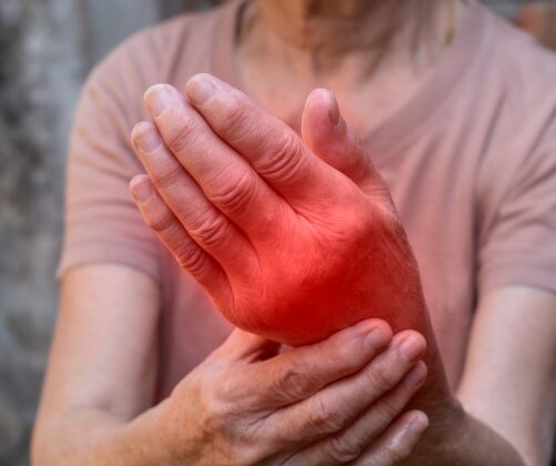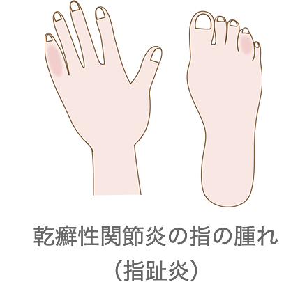 関節リウマチ両側の手首・足首や手指・足趾の関節の腫れと痛み。