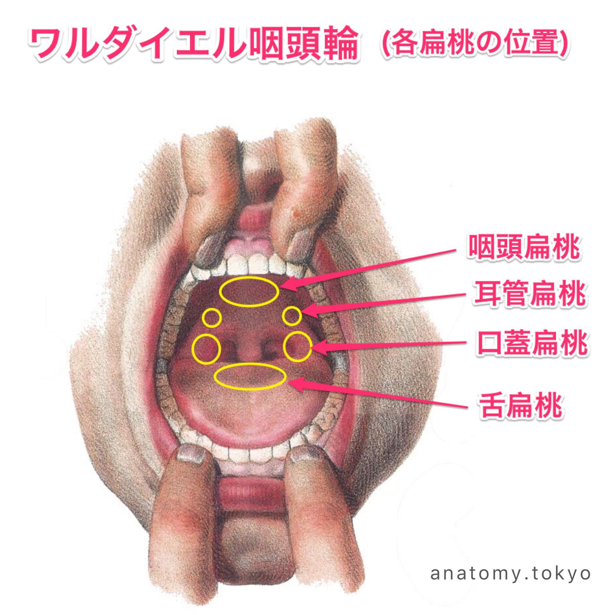 黒澤一弘 かずひろ 解剖学IT教育・指圧師・ラダック on X: "口蓋扁桃・舌扁桃・咽頭扁桃・耳管扁桃は、食物や空気の入り口を取り囲むような位置に配列しているところからと呼ばれる解答ワルダイエル咽頭輪 口蓋扁桃・舌扁桃・咽頭扁桃・耳管扁桃はワルダイエル。
