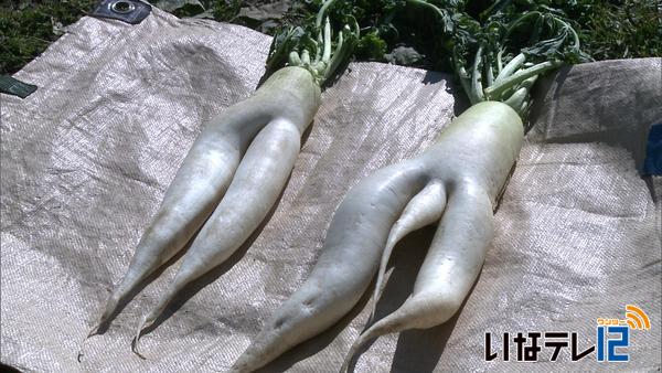 西箕輪の伊藤直人さんの畑で人の足の形をした大根ニュース伊那谷ねっと。