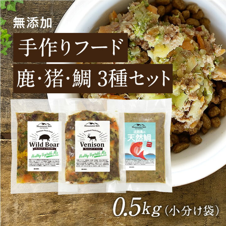 楽天市場手作りフード 鹿・猪・鯛 3種セット 0.5kg小分け袋 国産 無添加 ドッグフード ウェットフード 手作り ごはん トッピング 鹿肉猪肉 真鯛100g×5 鹿×2・猪×2・鯛×1 鹿肉 猪肉 真鯛 健康 長生き ドッグフード ウェットフード 犬用 シニア アレルギー : 淡路。