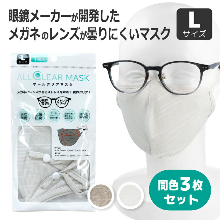 同色3枚セット メガネが曇りにくいマスク Lサイズ オールシーズン 洗える 抗菌 防臭 眼鏡 オールクリアマスク ALLCLEAR MASK。