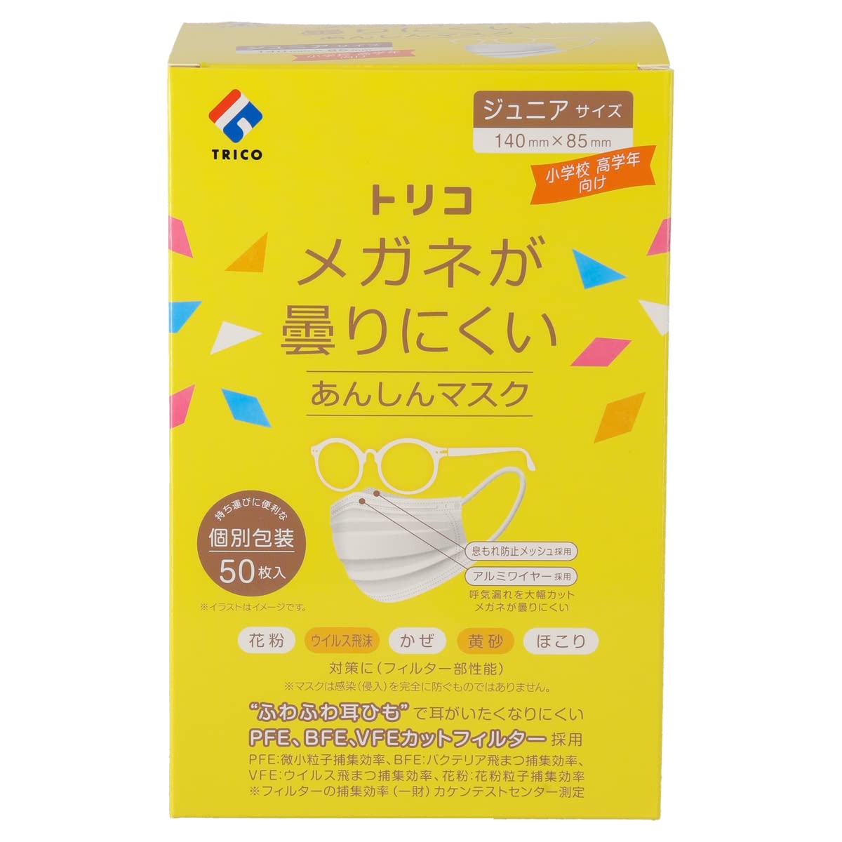 たのめーる トリコ メガネが曇りにくいあんしんマスク 個包装 ジュニアサイズ 1箱 50枚 の通販。