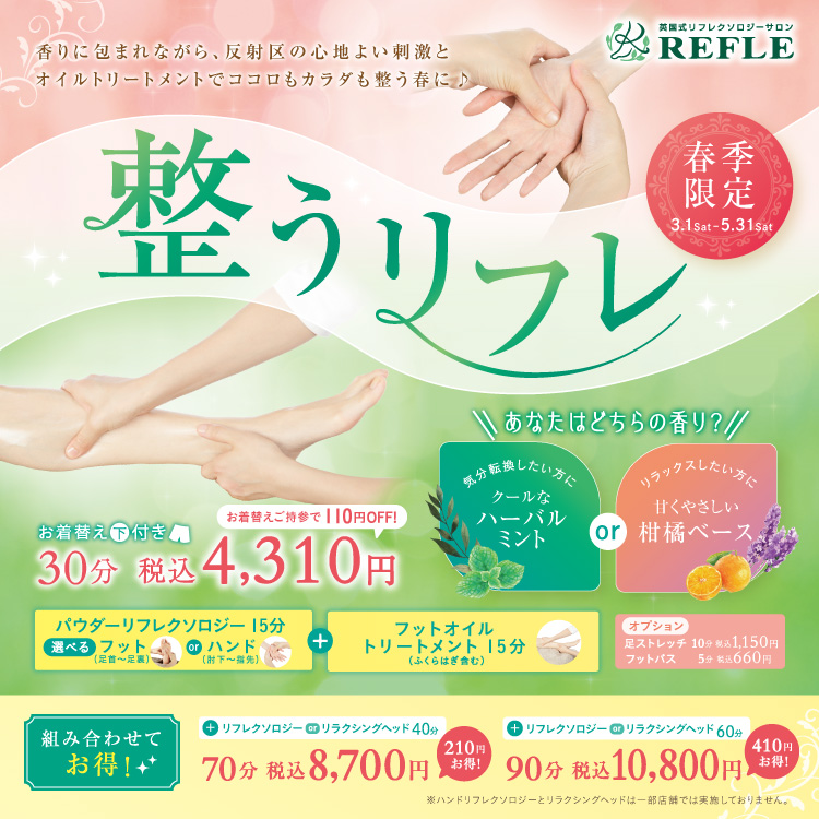 春季限定 整うリフレ REFLE癒やしのリラクゼーションサロンマッサージファンにも選ばれるラフィネグループ。
