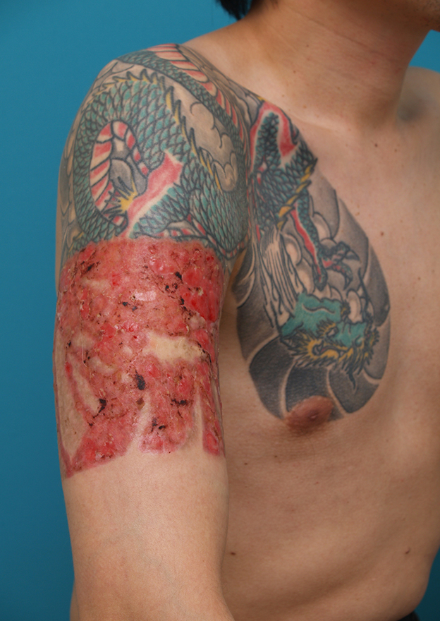 症例写真 肩の大きな入れ墨を剥削手術 削って消す治療 で一回で除去した症例:美容外科 高須クリニック。