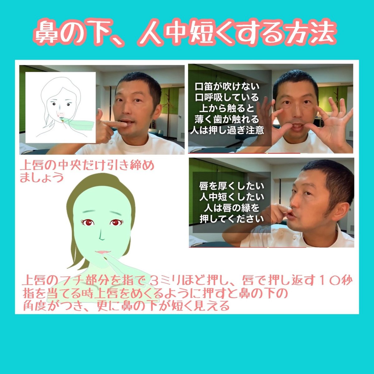 鼻の下、人中を短くする方法10秒口輪筋トレーニング方法お顔の整体師 戸塚哲春。