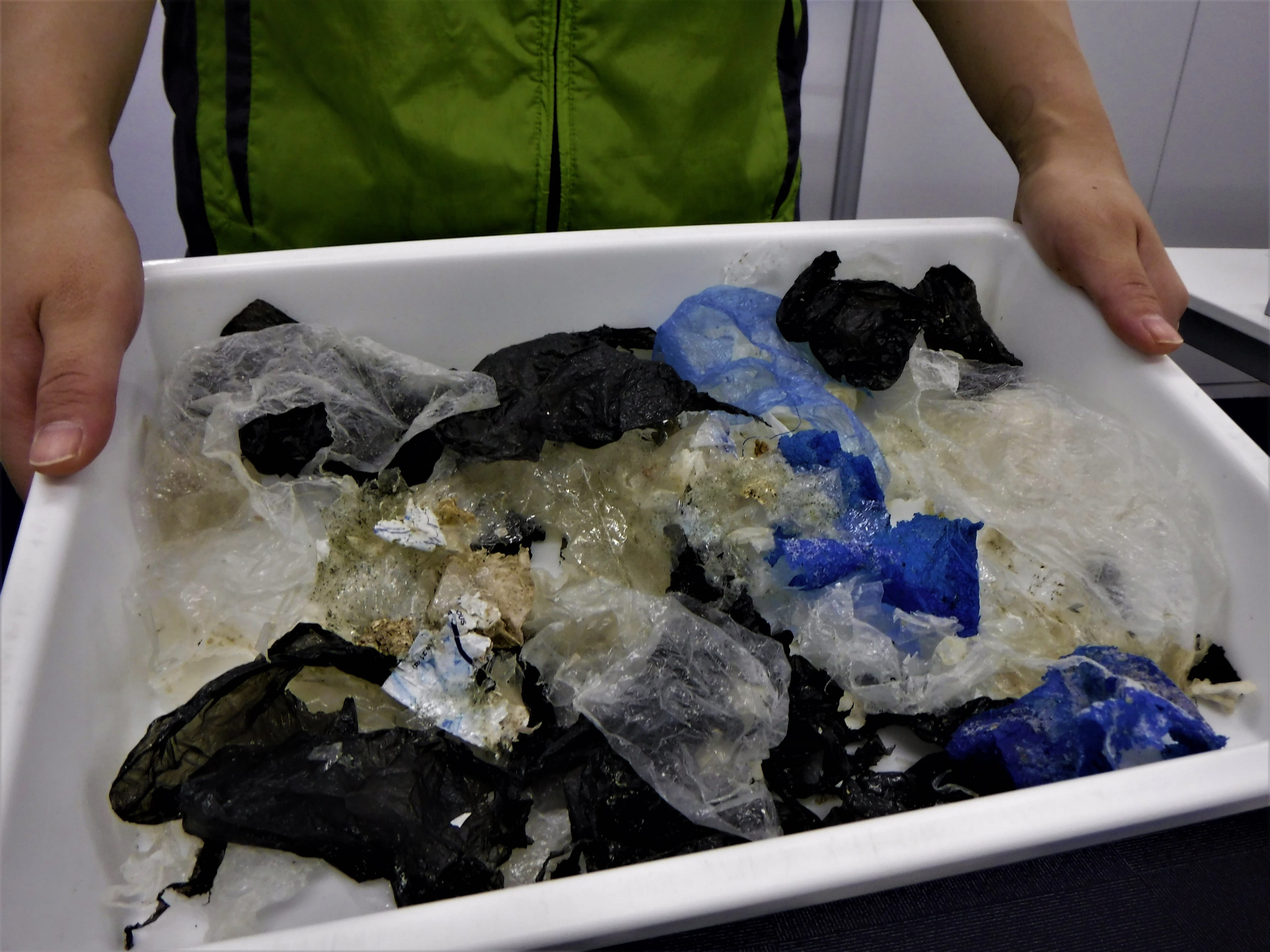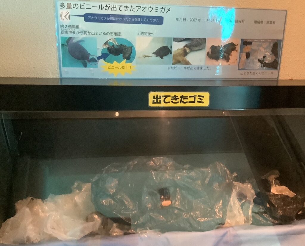 ウミガメと排泄されたプラスチックゴミ渚の交番・はざこネイチャーセンタ。