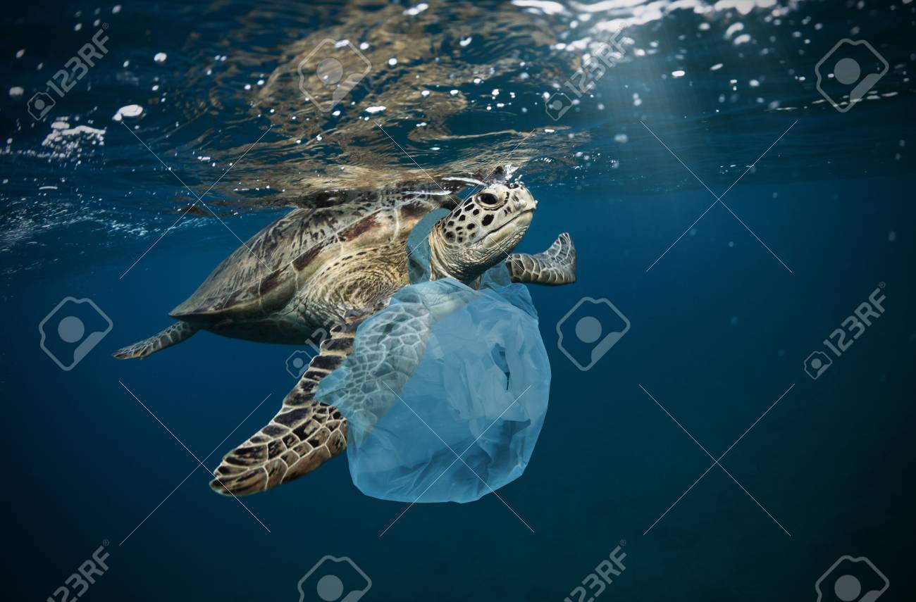 プラスチック汚染問題 – 亀はビニール袋を食べる写真素材1125207806Shutterstock。
