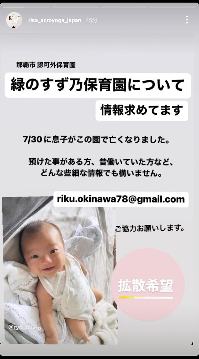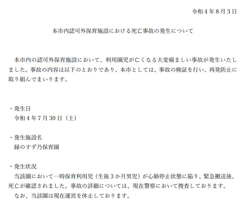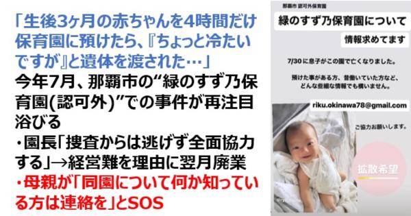 滝沢ガレソ on X: "「生後3ヶ月の赤ちゃんを4時間だけ保育園に預けたら、『ちょっと冷たいですが』と遺体を渡された 」 今年7月、那覇市の“緑の すず乃保育園 認可外 ”での事件が再注目浴びる ・園長「捜査からは逃げず全面協力する」→経営難を理由に翌月廃業 ・母親が。