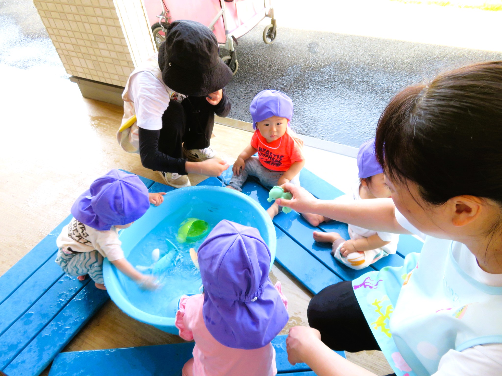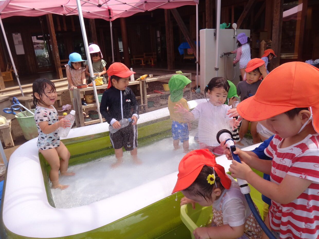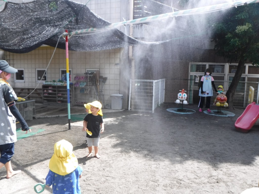 第二-8 15 いい笑顔0歳水遊び・1歳2歳合同保育ミストシャワーと水遊び草深こじか保育園 幼保連携型認定こども園草深こじか第二保育園こじかKIDSクラブ。