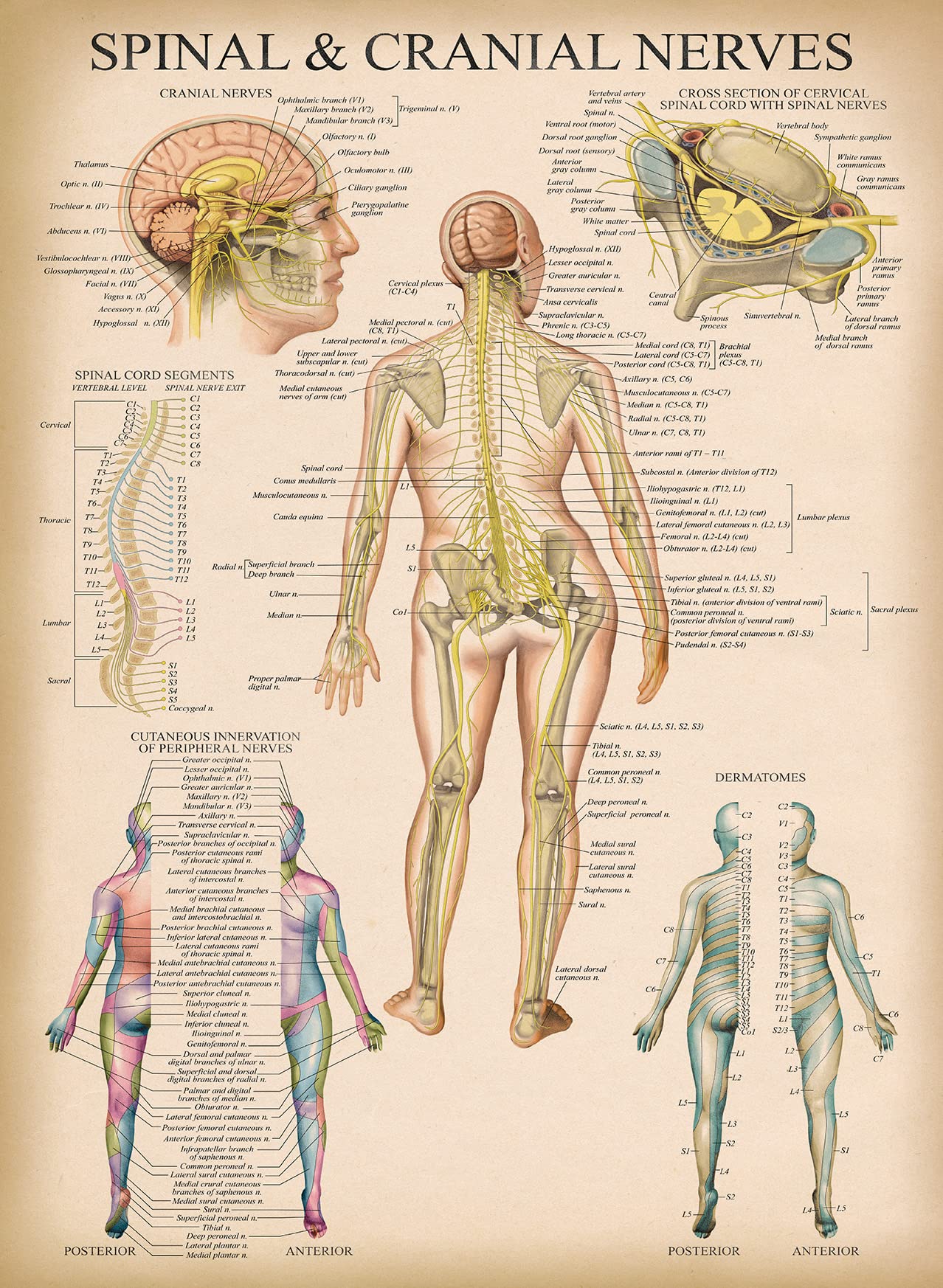Palace Learning ヴィンテージ 脊髄神経 解剖図 - 脊椎と頭蓋神経 解剖ポスター皮膚科付きラミネート加工 - 18インチ x24インチ。