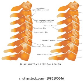 頸椎。脊椎解剖学の頸部。頸椎 – 側面図 側面図 。 頸部の痛み – 椎間板 変性、膨張、ヘルニア、間伐、骨生物による変性 」のイラスト素材1995190646Shutterstock。