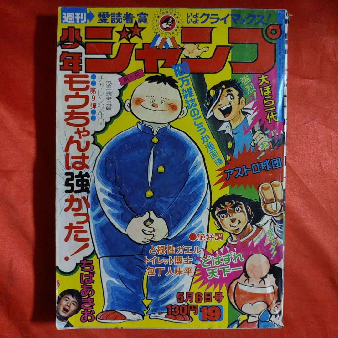 週刊少年ジャンプ 昭和49年19号 昭和49年5月6日号 表紙画・ちばあきお「モウちゃんは強かった!」読切 ちばあきお「モウちゃんは強かった!-第2回愛読者賞チャレンジ作品 第9弾-」46頁カラー有連載 ジョージ秋山「どはずれ天下一」、本宮ひろ志、吉沢やすみ、とり。