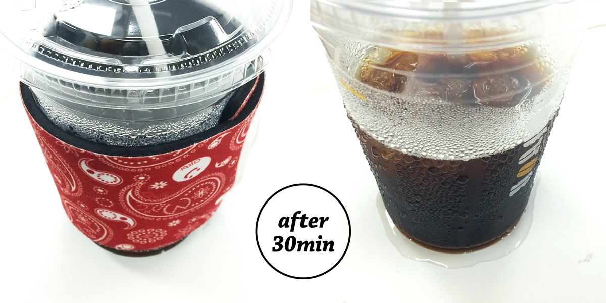 アイスコーヒーカップの結露の水滴対策に「通せるカップスリーブ」。