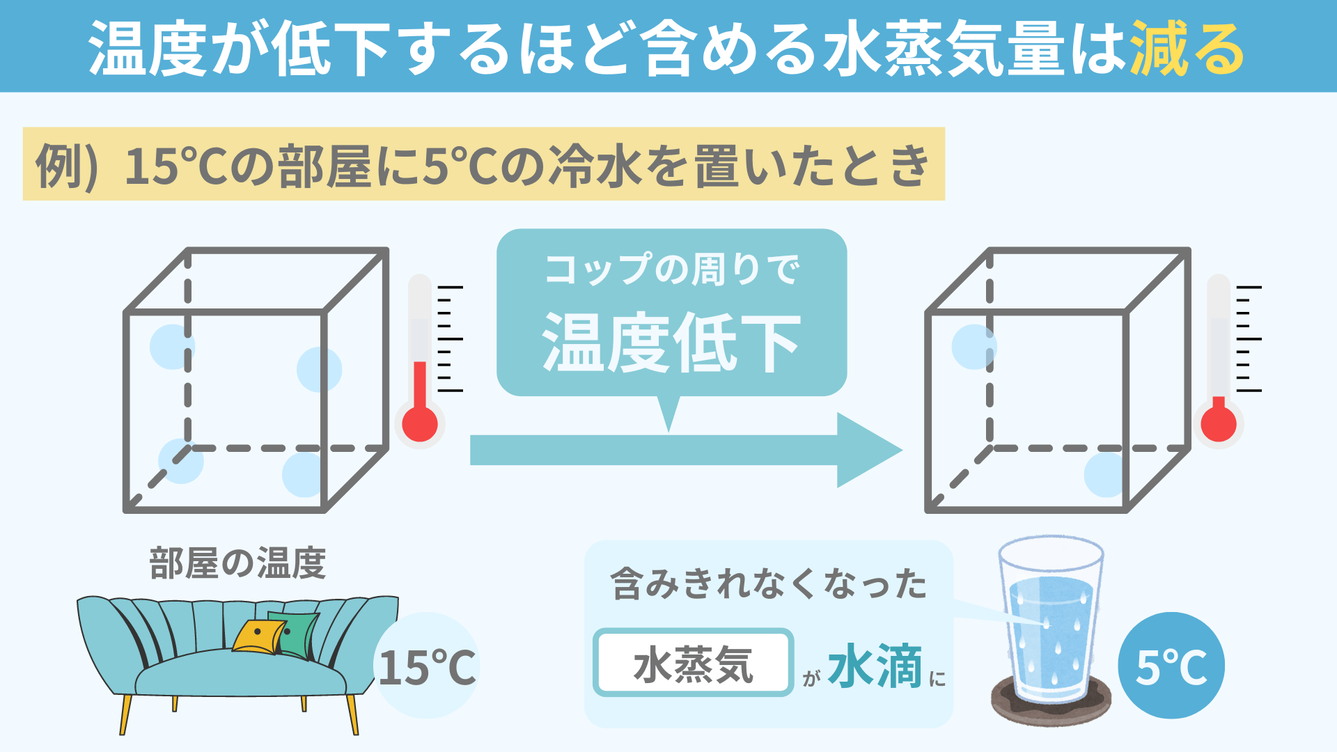 「なぜ冷たいコップに水滴がつくの?水滴がつかないようにできるの?冷やすとくもる謎に迫ります」凝結露点 飽和水蒸気量。