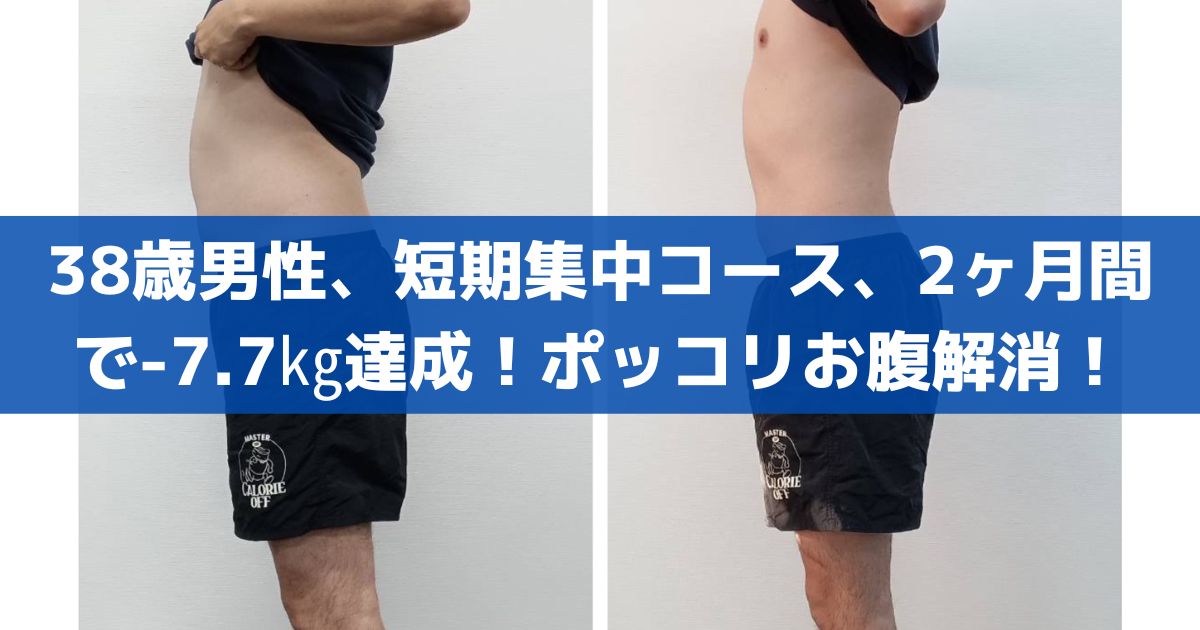 38歳男性、短期集中コース、2ヶ月間で-7.7㎏達成!ポッコリお腹解消!守谷市のダイエット専門パーソナルジムREGUTS リガッツ 守谷店。