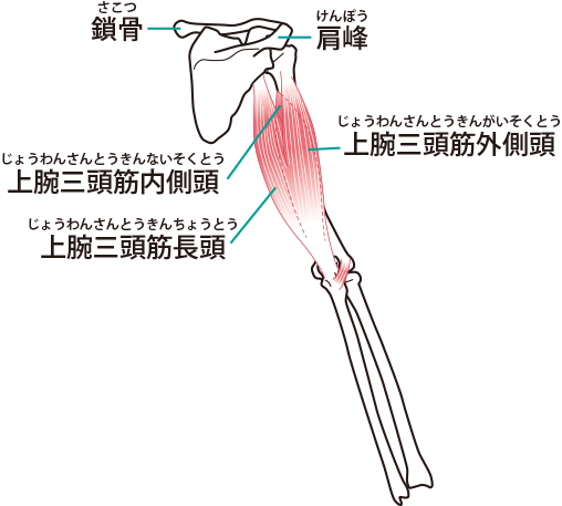 上腕三頭筋 じょうわんさんとうきん上腕三頭筋には 上腕骨から尺骨に付着する 内側頭、外側頭 肩甲骨から尺骨に付着する 長頭があり 肩側の付着部が 長 頭、内側頭、外側頭の 3つに分かれているので 三頭筋と呼ばれ 内側頭と外側頭には 肘関節を伸展させる肘を伸ばす。