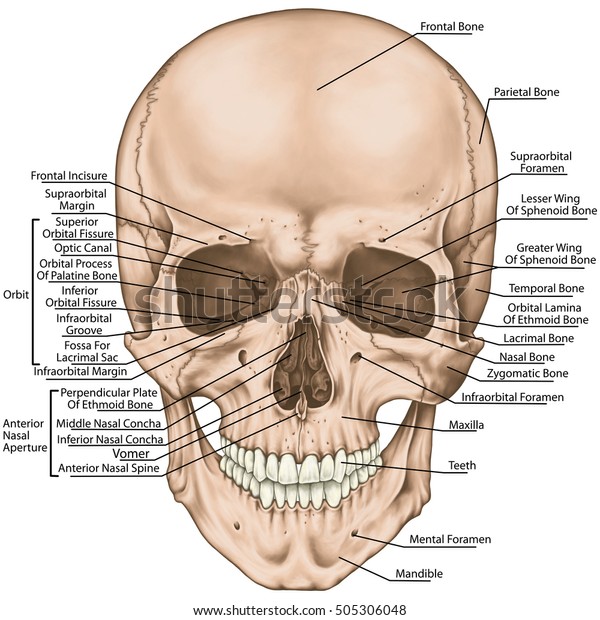 頭蓋骨、頭の骨、頭蓋骨。顔の骨格の境界、内臓頭蓋。鼻腔、前鼻孔、軌道。前面図。」のイラスト素材 505306048Shutterstock。