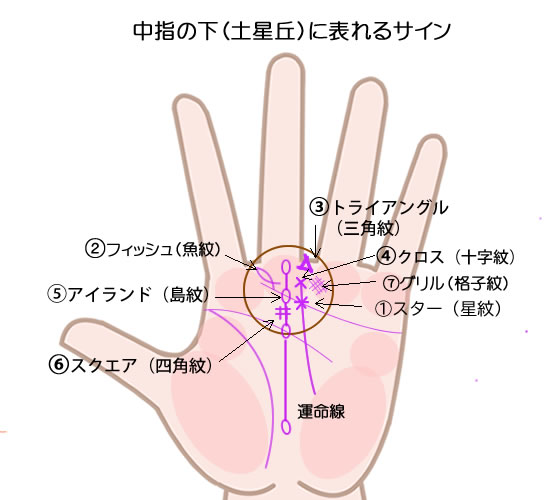 中指の下 土星丘 の丘や線にあらわれるスター・フィッシュ・スクエアなどサインの意味uranai cafe Quartz 占いカフェクオーツ。