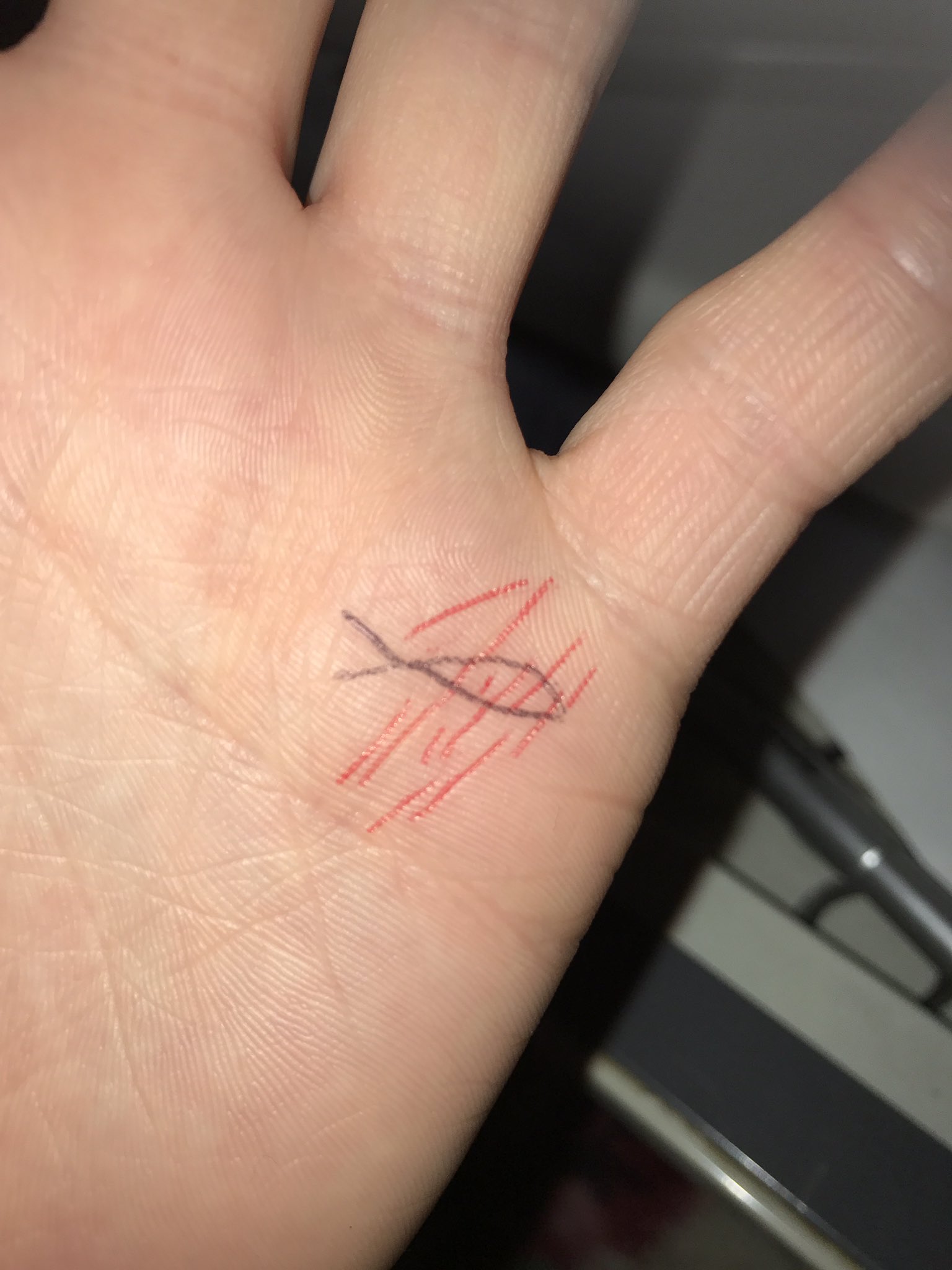 ファアル☃️ on X: "薄いけど突如財運線 赤線 のそばに現れた魚紋 フィッシュ 。 フィッシュはどこに現れても吉相で、財運線と重なって出た場合は特に大きな財を手にするとか。ずっと手相は見てきたけど、島紋じゃなくてちゃんとしたフィッシュっぽいのが出たのは。